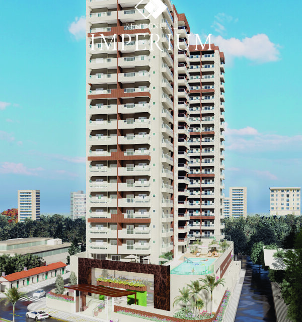 Frente ao mar, no bairro Vila Mirim, 2 torres com apartamentos de 2 e 3 dorms.